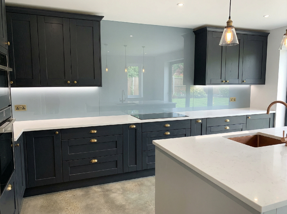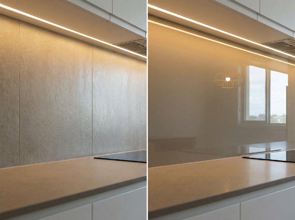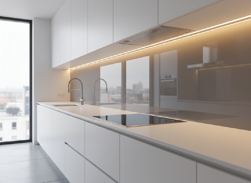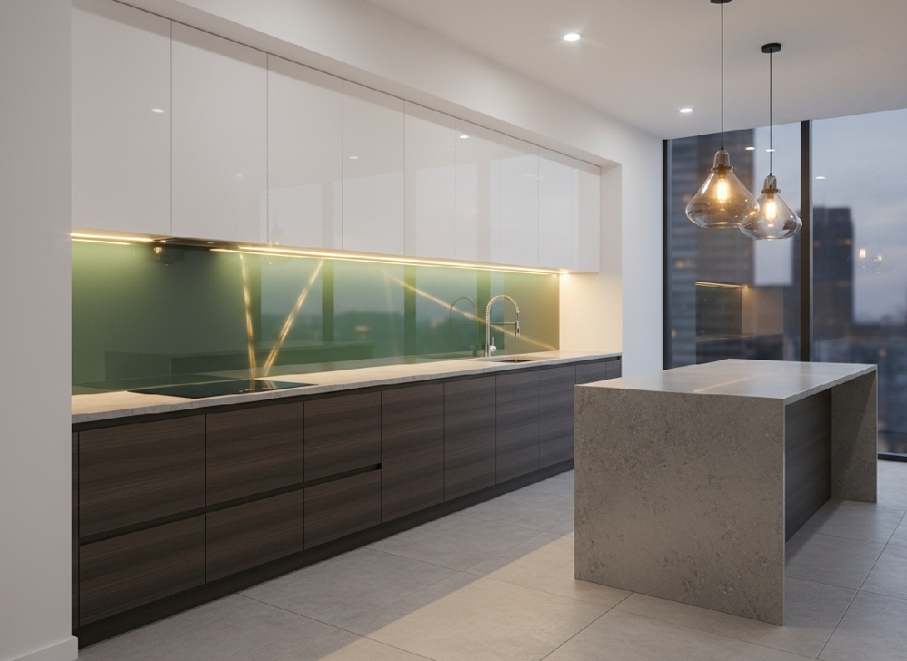 A reflective splashback—particularly toughened glass—acts as a secondary amplifier for both natural and artificial light. Instead of light stopping at the wall, it is redistributed across the workspace.