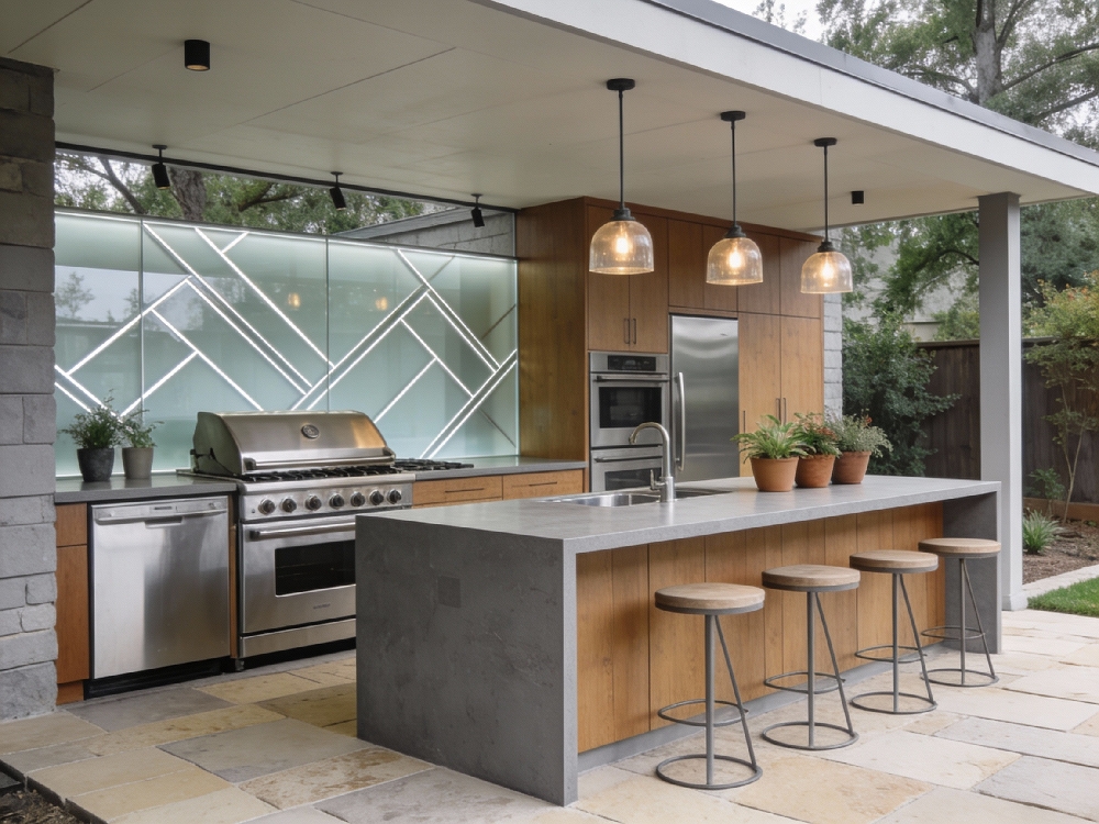 In covered outdoor kitchens or barbecue areas, splashbacks can be used provided materials are suitable for temperature changes and exposure conditions. Glass splashbacks may be used in sheltered areas, while other durable materials may be more appropriate in fully exposed settings.