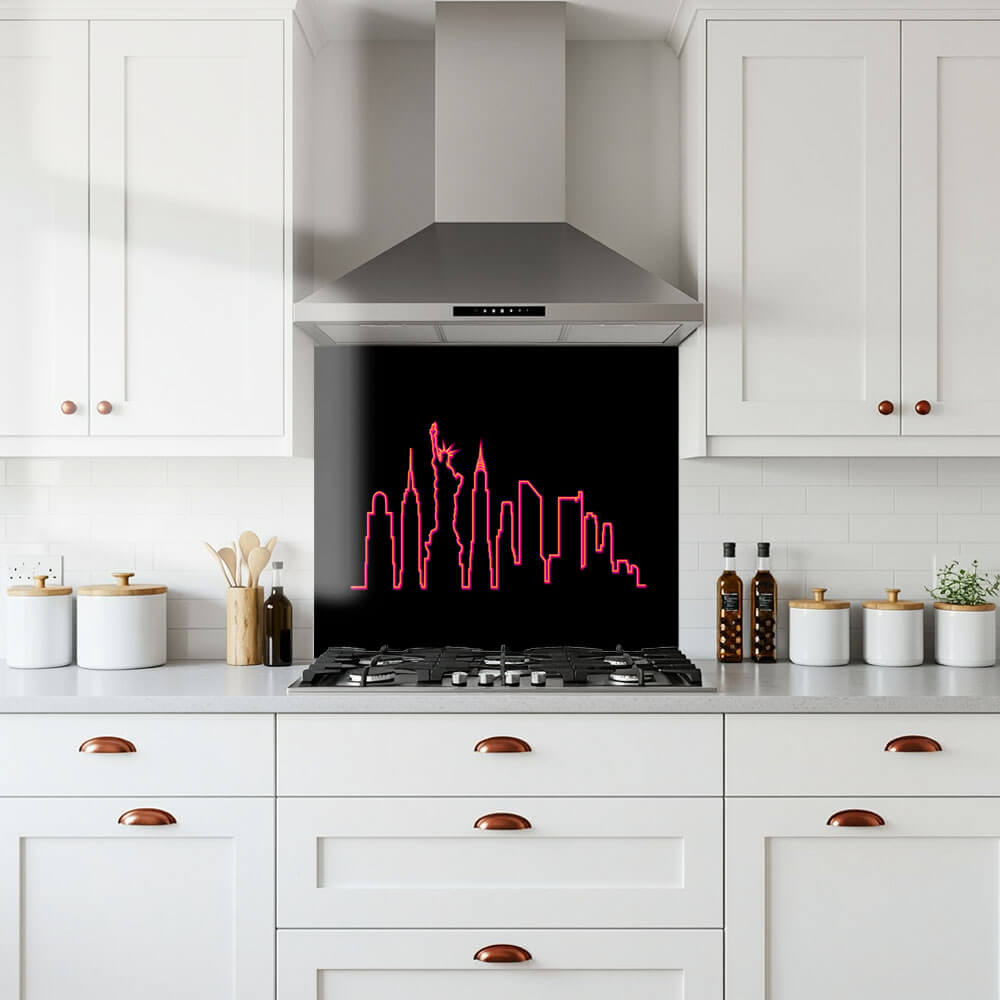 Elevate your kitchen or bathroom with this Neon NY Glass Splashback from our Urban range. Featuring a high-resolution image of the NY Skyline in Neon Crafted from durable, tempered glass, it is heat-resistant, easy to clean, and offers a sleek, modern finish. Perfect for those who admire classic landmarks and timeless beauty, this splashback is available in various sizes to seamlessly integrate into your décor, enhancing any room.